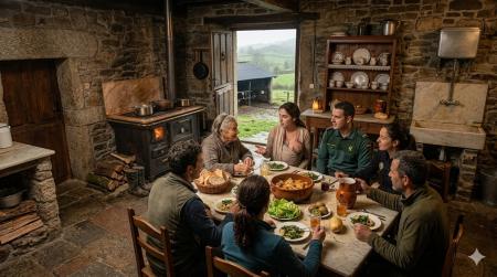 La madre, que no viaja más allá de la Galicia profunda, invita a cenar a los viajeros. La mesa de mármol está a uno y otro lado de la cocina “bilbaína” de hierro fundido. El vino se calienta por eso antes de llegar a la garganta. Lo mejor de su país y huerta llenará nuestros platos. Si mata a su gallina, habrás de “pecar”, dejar de ser por esa noche el raro vegetariano. Quisieras que esa velada, tan diferente de las habituales, no se acabara…